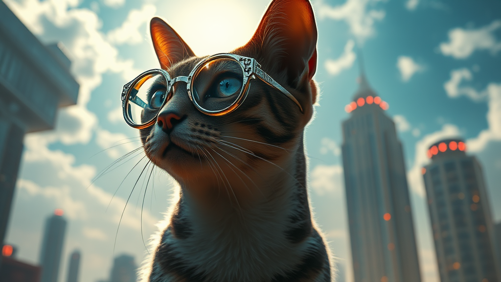 A sleek feline adorned in intricate, crystal-clear spectacles stands poised under a dynamic, cinematic glow; their eyes reflecting an otherworldly landscape. Set in a sprawling, futuristic realm that seamlessly merges steel skyscrapers with epic fantasy elements, the scene is captured in breathtaking detail, revealing a mystical adventure in stunning 8k resolution. The sky hums with energy, casting ethereal patterns across the cat's poised silhouette, tempting curious minds with tales of enchantment and technology in perfect harmony.