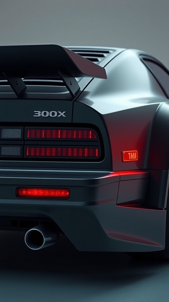 A sleek futuristic 1984 Nissan 300ZX featuring an aggressive wide body design with aerodynamic vents, complemented by custom LED tail lights that glow with a striking intensity. The exterior boasts intricate carbon fiber detailing that adds a modern touch to its classic form. Captured through the lens of a Canon D500, this immaculate vehicle is presented on Portra 200 film in RAW format, exuding a nostalgic film-like quality. Enhanced with subtle neon underglow and matte black racing stripes, the car embodies a perfect blend of retro and futuristic elements.