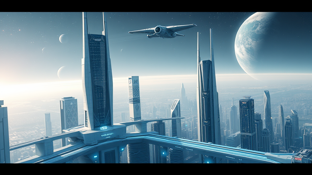 A sleek futuristic cityscape with towering skyscrapers characterized by clean lines and geometric shapes, connected by glowing sky bridges; a limited color palette of silver, blue, and white emphasizes the modern aesthetic, while advanced spaceships glide effortlessly overhead, weaving through a canvas of twinkling stars and a distant planetary horizon.