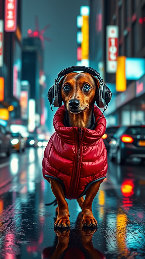 A sleek, futuristic dachshund stands confidently on the rain-soaked streets of a neon-lit city. Its fur is a deep, rich red that gleams under the vibrant lights. One piercing blue eye contrasts with the other warm brown, giving the dog an intriguing gaze. Large, modern-styled headphones, a nod to timeless fashion, sit snugly over its ears, pulsing with the rhythm of an invisible beat. The dachshund is wrapped in a high-tech, weatherproof red down jacket that subtly shifts its hue with the shifting lights of the city. Raindrops dance off the jacket as it stands poised on the slick road, surrounded by the bustle of futuristic vehicles and towering skyscrapers that pierce the misty night sky.