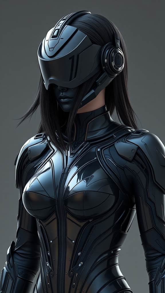 A sleek, futuristic female cyborg with dark, glossy armor and a form-fitting bodysuit, her flowing jet-black hair contrasts with the advanced headgear featuring a mechanical facial visor. Her body is adorned with intricate armor elements that highlight her form, enhanced by HDR lighting effects. The design features subtle subsurface scattering for a lifelike finish, all rendered in stunning 8K detail with octane render technology.