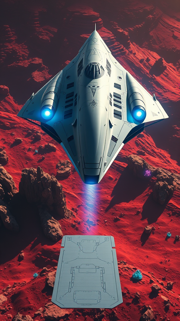 A sleek, futuristic spaceship descends gracefully onto the rugged surface of the alien planet, its polished metallic hull reflecting the intense, sharp sunlight. The ship's aerodynamic design features intricate patterns and glowing blue thrusters, casting an otherworldly shadow on the red-hued terrain below. Jagged rock formations and vibrant crystalline structures dot the landscape, creating a striking contrast with the smooth landing pad that extends from the belly of the ship. The harsh, contrasting lighting accentuates every curve and angle of the spacecraft, while the brilliant sun ignites the shimmering colors of the alien world's surface, painting a vivid and otherworldly panorama.
