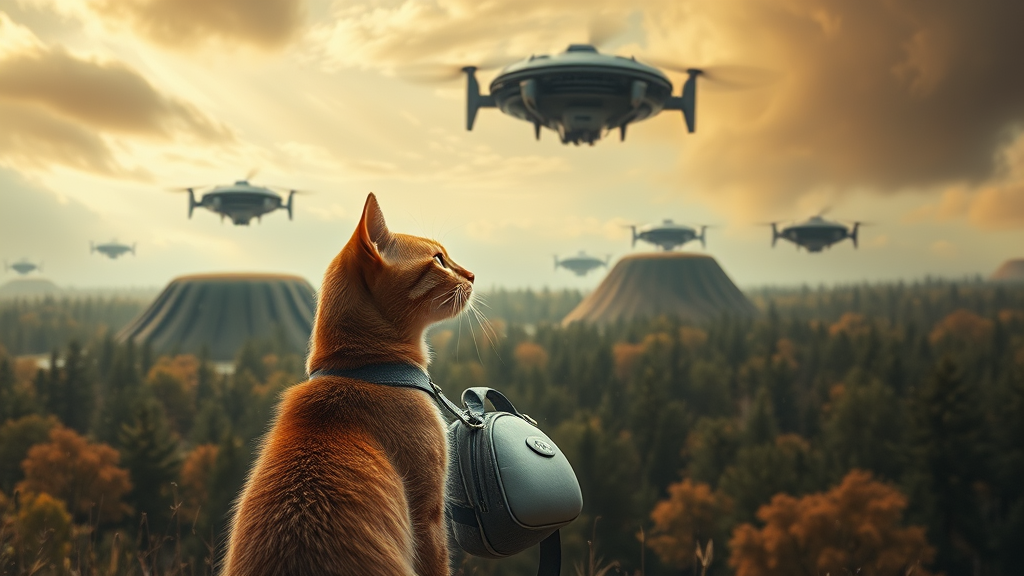 A sleek ginger cat stands amid a vast, futuristic forest, where the air hums with the presence of flying machines suspended from colossal, hovering mounds above. The sky is a tapestry of swirling amber clouds, releasing gentle raindrops that patter on the cat's fur as it curiously watches the enigmatic, floating contraptions. A compact, silver backpack is securely fastened around its neck, catching the light as it peers into the mesmerizing scene, captured from a sweeping, cinematic perspective.