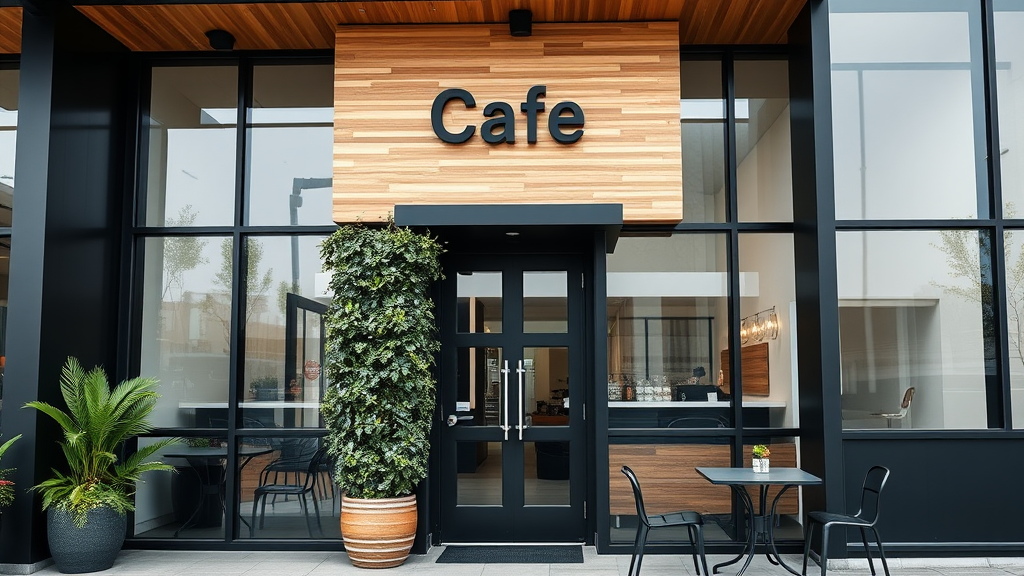A sleek glass-fronted cafe with a minimalist design features a seamless blend of black steel and natural wood accents. Large, clear windows extend from floor to ceiling, allowing an abundance of natural light to illuminate the interior. The entrance is framed by a subtle overhang adorned with a vertical garden that introduces a touch of greenery. The cafe name is elegantly emblazoned in matte black lettering above the door, offering a crisp, understated look. A small outdoor seating area is defined by simple, modern black metal tables and chairs, harmonizing with the facade's clean lines.