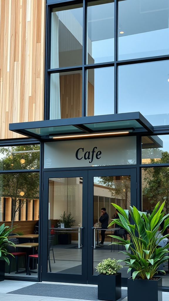 A sleek, glass-fronted cafe with floor-to-ceiling windows, framed by matte black steel, allowing natural light to flood the interior. The entrance features sliding glass doors with brushed steel handles. Above, a thin, minimalist canopy made of matte black metal extends slightly, providing subtle shade. The facade is accented with vertical wooden slats made of light, natural oak, adding warmth against the stark metal and glass. LED strip lighting integrated into the roofline casts a gentle glow in the evening. The cafe's name is elegantly displayed in lowercase, sans-serif lettering etched onto a frosted glass panel. Lush, green plants in thin, rectangular black planters line the entrance, introducing a touch of nature to the modern design.