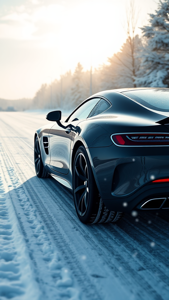 A sleek, hyper-realistic black luxury Mercedes sports car glides effortlessly along a pristine snow-covered highway, its polished body gleaming under the soft winter sun as fine snowflakes dance around it, highlighting the contrast between the car's elegance and the serene, icy landscape.