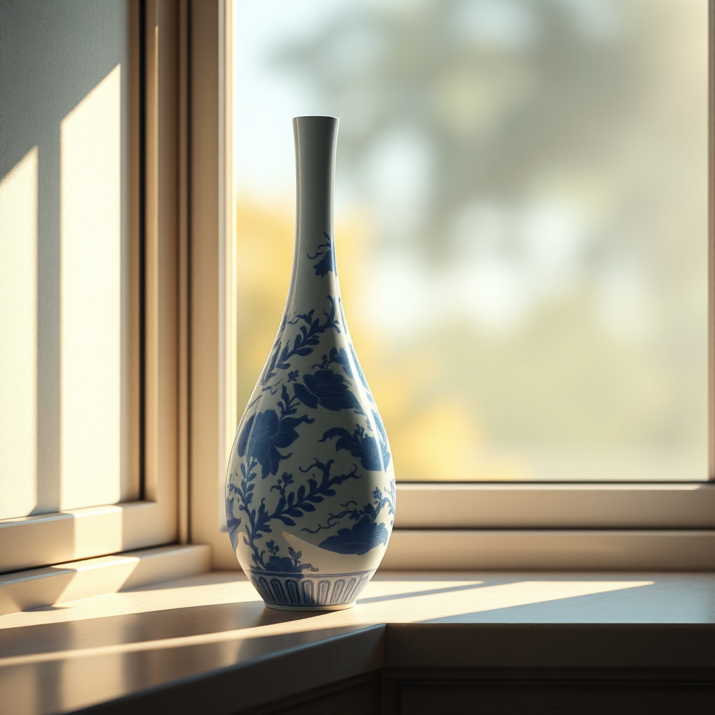 A sleek, long-necked Chinese blue and white porcelain vase resting on a sunlit window sill, its intricate patterns captured in a hyper-realistic 3D render, inspired by Christian Hilfgott Brand's style, showcased on CG Society. The scene embodies precisionism with its meticulous attention to detail, set against a backdrop of soft studio lighting that accentuates the vase's elegant contours. The composition is enhanced by a hint of warm sunlight streaming through the window, casting delicate shadows across the surface, creating a contrast between the smooth porcelain and the textured sill, presenting a serene, harmonious balance in a wide aspect ratio of 16:9.
