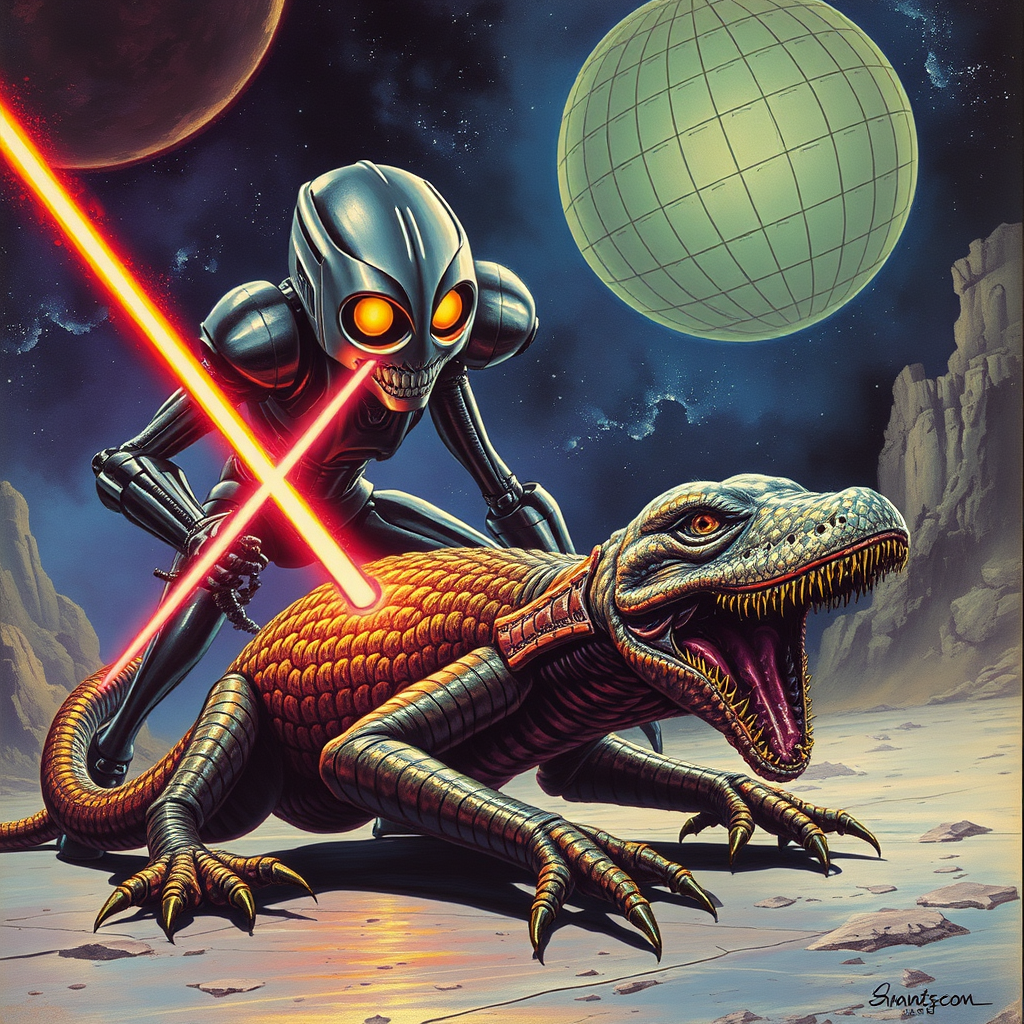 A sleek metallic robot emits intense laser beams from its glowing eyes, targeting an extraterrestrial creature with shimmering scales as it is dragged across the floor by serpentine appendages, set against a dynamic, galactic backdrop, evoking the styles of Robert McGinnis and Frank Frazetta, with vivid colors and dramatic composition.