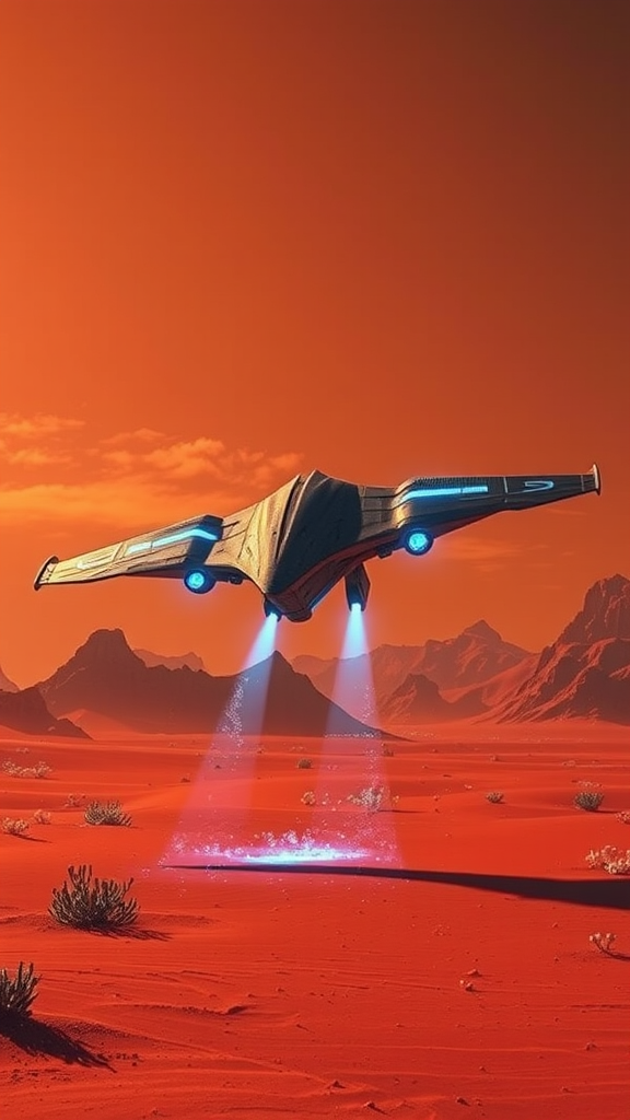 A sleek, metallic spaceship resembling a colossal bird of prey descends gracefully onto the crimson sand of an alien planet. Its wings, etched with glowing lines, fold seamlessly against its streamlined body, while pulsating thrusters emit a vibrant blue hue against the stark, amber sky. Jagged mountain ranges loom in the distance, their peaks piercing through wisps of ethereal clouds. Bioluminescent plant life decorates the landscape, casting an otherworldly glow that contrasts sharply with shadows cast by the ship. As the spacecraft gently touches down, its landing gear kicks up iridescent dust that shimmers momentarily before settling, painting a mesmerizing scene that blends advanced technology with an exotic, alien world.