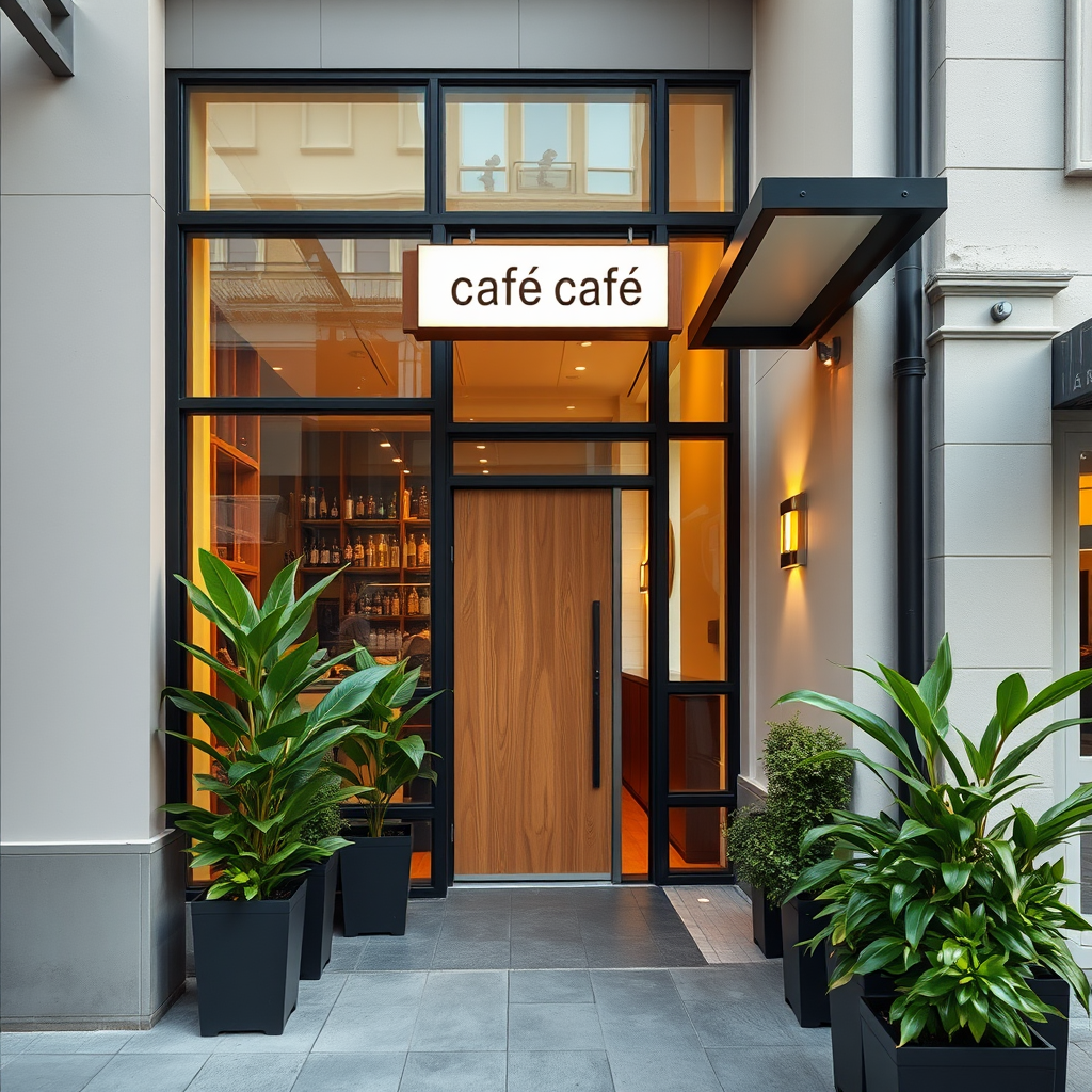 A sleek, minimalist cafe facade featuring clean lines and large glass panels that allow natural light to flood the interior, accented with a subtle, matte black metal frame. The entrance is marked with an understated wooden door, blending seamlessly into the design. A simple, elegant sign displaying the cafe’s name in sans-serif font is illuminated by warm, indirect LED lighting. Lush green plants in modern, geometric planters line the sidewalk, adding a touch of nature, while a narrow canopy provides shelter and enhances the streamlined look. The exterior color palette consists of soft neutrals and earthy tones, complementing the surrounding urban environment.