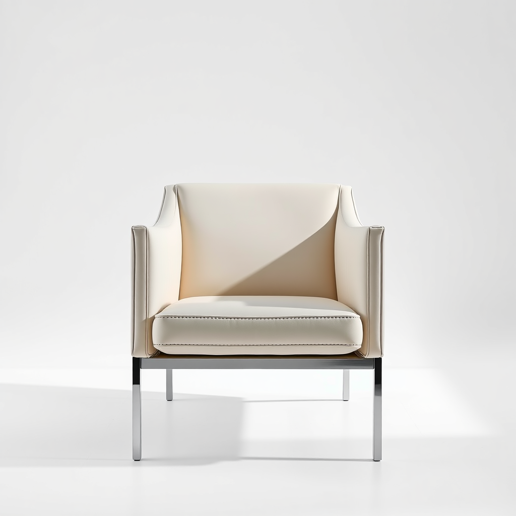 A sleek, minimalistic chair set against a bright white studio backdrop, captured through the lens of a Hasselblad X1D II 50C with a 90mm focal length. The chair's smooth contours and fine stitching are accentuated, with a subtle play of light and shadow highlighting its elegant texture, slightly enhancing the stitching detail for added sophistication.