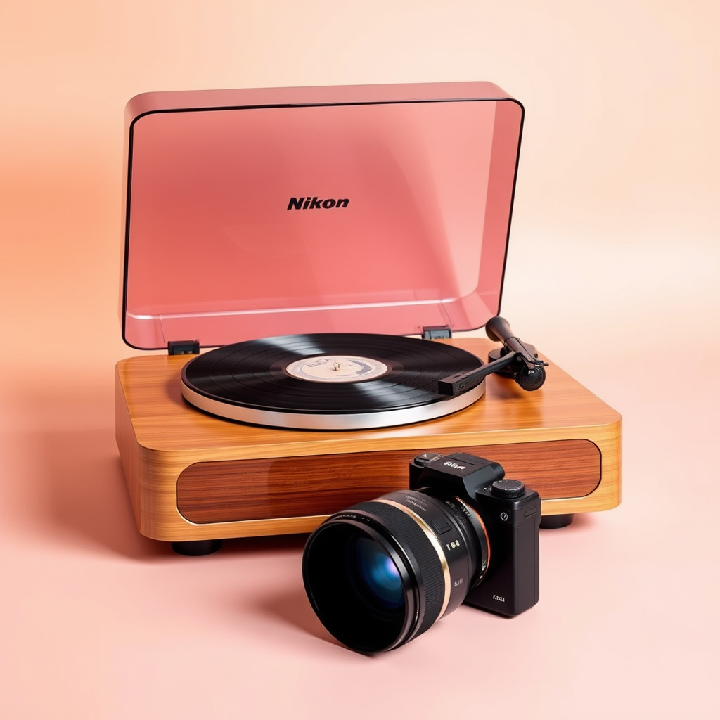 A sleek modern record player inspired by Dieter Rams' Braun SK4, reminiscent of Snow White with its minimalist design, paired with a futuristic camera like the Nikon Z9 and a NIKKOR Z 50mm f/1.2 S lens, highlighted against a contrasting transparent yet vibrant background, with subtle creative tweaks maintaining its iconic essence.