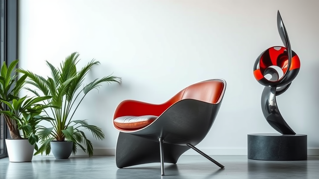 A sleek modernism chair in a contemporary studio setting, captured with a 90mm lens, showcasing the juxtaposition of smooth steel and vibrant colored glass textures, surrounded by lush greenery and a striking, abstract sculpture.