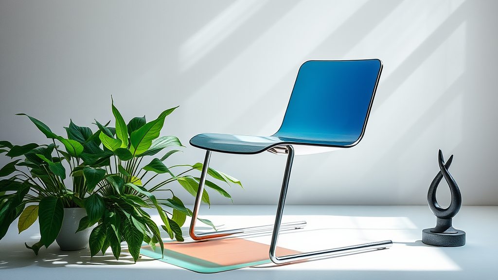 A sleek, modernist chair crafted from steel and colorful glass sits elegantly in a minimalist studio setting, captured through the clarity of a 90mm lens. Soft light cascades over the surfaces, highlighting the chair's seamless design and texture. Lush green plants contrast with the industrial elements, adding a touch of nature and balance to the scene. Nearby, a small, contemporary sculpture echoes the chair's aesthetic, tying the composition together in a harmonious blend of art and design.