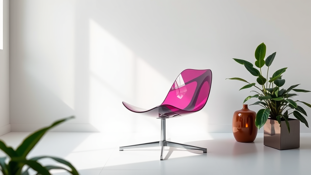 A sleek modernist chair in a minimalist studio space, captured with a 90mm lens, featuring a blend of polished steel and vibrant colored glass textures, accompanied by lush green plants and a subtle decorative object reflecting contemporary aesthetics.