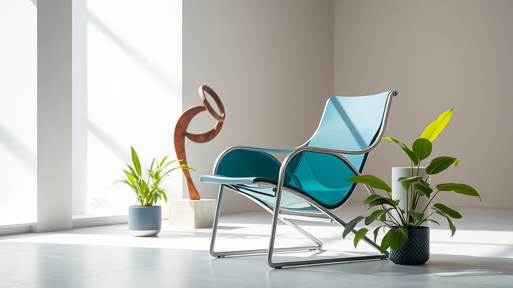 A sleek modernist chair in a well-lit studio setting, captured with a 90mm lens, featuring a sophisticated blend of steel and colored glass textures. The scene is complemented by a few lush green plants strategically placed to add a touch of nature, with a unique abstract sculpture in the background to enhance the artistic atmosphere.