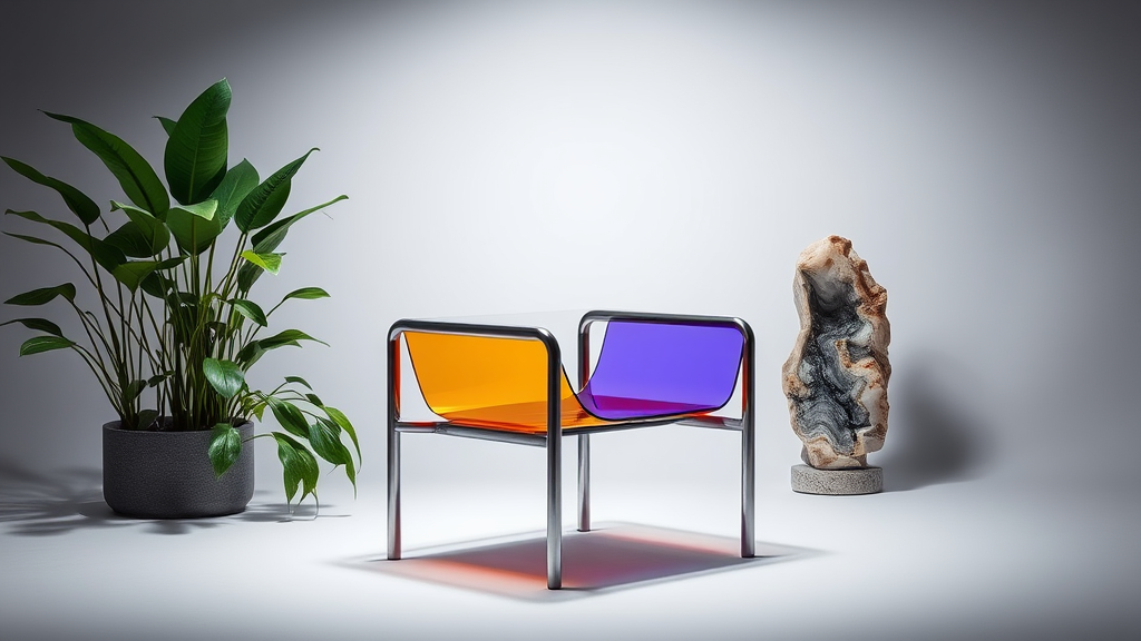 A sleek, modernist chair set in a minimalist studio environment, captured through a 90mm lens. The chair's structure features a blend of smooth steel and vibrant colored glass, creating an intriguing play of light and texture. To one side, a collection of lush, green plants adds a touch of organic contrast, their leaves softly reflecting the colors from the glass. In the background, a simple onyx sculpture provides an elegant focal point, completing the sophisticated scene.