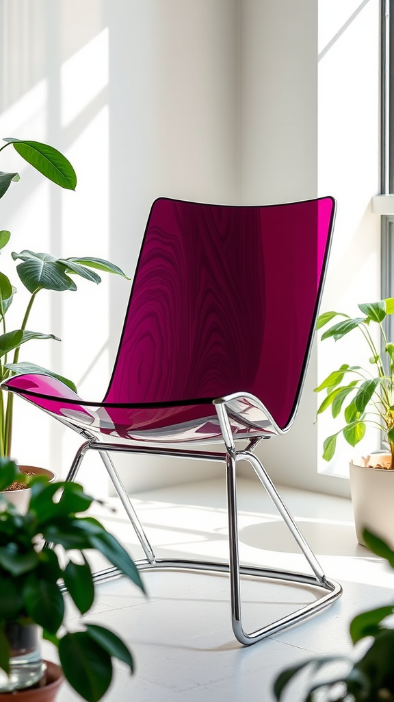 A sleek modernist chair with a minimalist design, set in an airy studio environment, captured through a 90mm lens, showcasing the intricate textures of polished steel and vibrant colored glass. Around the chair are a few elegant houseplants, their lush green leaves contrasting with the chair's contemporary materials, while soft natural light filters in, adding a touch of warmth and depth to the scene.