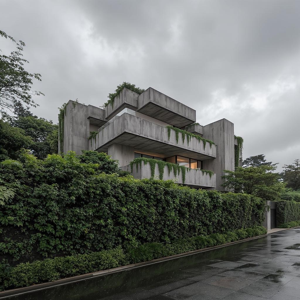 A sleek, modernist residence framed by verdant foliage, featuring a raw, exposed concrete exterior with staggered, rectangular and cantilevered segments. Each concrete block boasts sharp, clean lines and varying depths, creating a dynamic sense of form and shadow. Integrated greenery cascades over the edges of the concrete, harmonizing the stark, industrial design with the organic surroundings. Captured with a high-resolution DSLR or mirrorless camera using a wide-angle lens, the image captures the entire width of the structure and its lush environment. The small aperture setting ensures a deep depth of field for sharp focus on both the architectural details and the vibrant foreground vegetation. The composition is balanced and symmetrical, with the building centrally placed. It occupies the midsection of the image, with rich greenery at the base and a dramatic, cloud-filled sky crowning the top, establishing a harmonious, layered aesthetic. Soft, diffused light from the overcast sky eliminates harsh shadows and accentuates the texture of the concrete, contributing to a moody ambiance. The shiny, rain-dappled pavement in the foreground gently mirrors the light and adds texture, grounding the scene in reality.