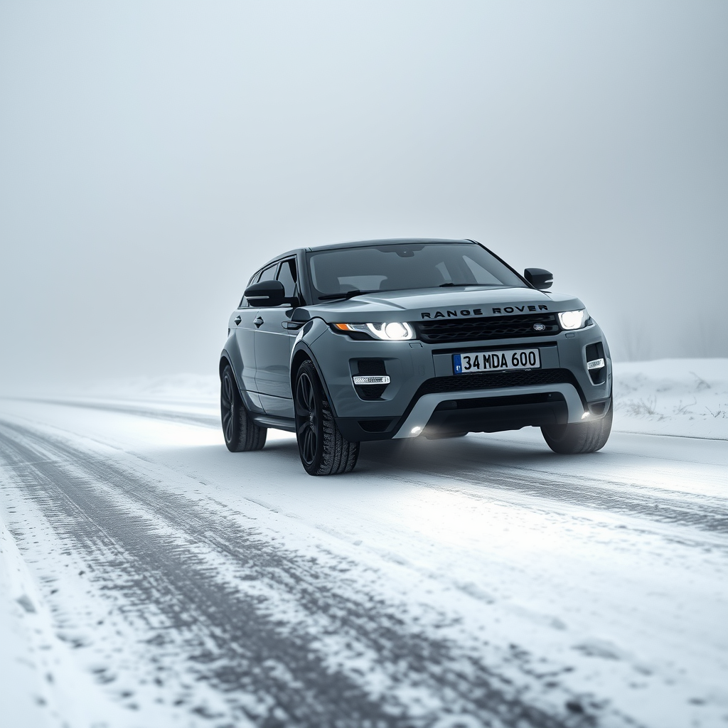 A sleek, modified 2012 gray Range Rover Evoque, bearing the license plate 34 MDA 600, glides along a snow-covered road. Its single-door design exudes elegance, while the headlights shine brightly, cutting through the misty atmosphere that surrounds it. The vehicle, polished to a high gloss, reflects the eerie yet captivating ambiance of the scene. A thick fog blankets the landscape, enhancing the mysterious and atmospheric quality akin to an Artgerm illustration, yet offering a sense of warmth and coziness reminiscent of hygge.