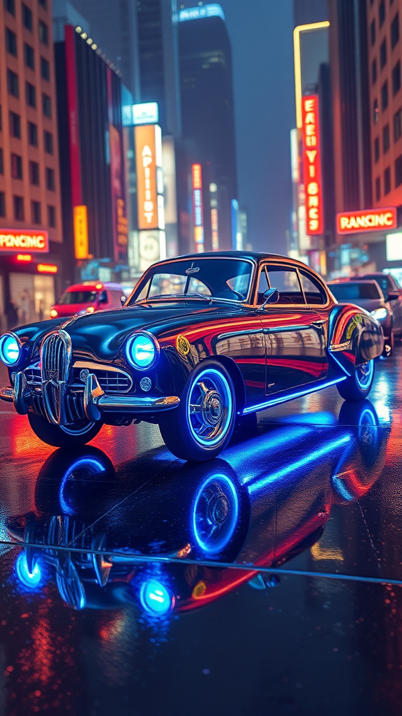 A sleek, neo-retro vehicle glimmers under the neon glow of a futuristic cityscape, blending classic 1950s curves with advanced cybernetic enhancements. Its polished chrome body features art deco detailing, while electric blue LED lights trace intricate patterns along the edges. The hubcaps spin silently over levitating wheels, generating a soft hum as the car glides effortlessly above the rain-slicked streets. Beneath the hood, a sophisticated AI engine purrs, seamlessly integrating vintage aesthetics with cutting-edge technology. Inside, the cockpit is adorned with plush leather seats and a holographic dashboard, offering a striking contrast between timeless elegance and future-forward innovation.
