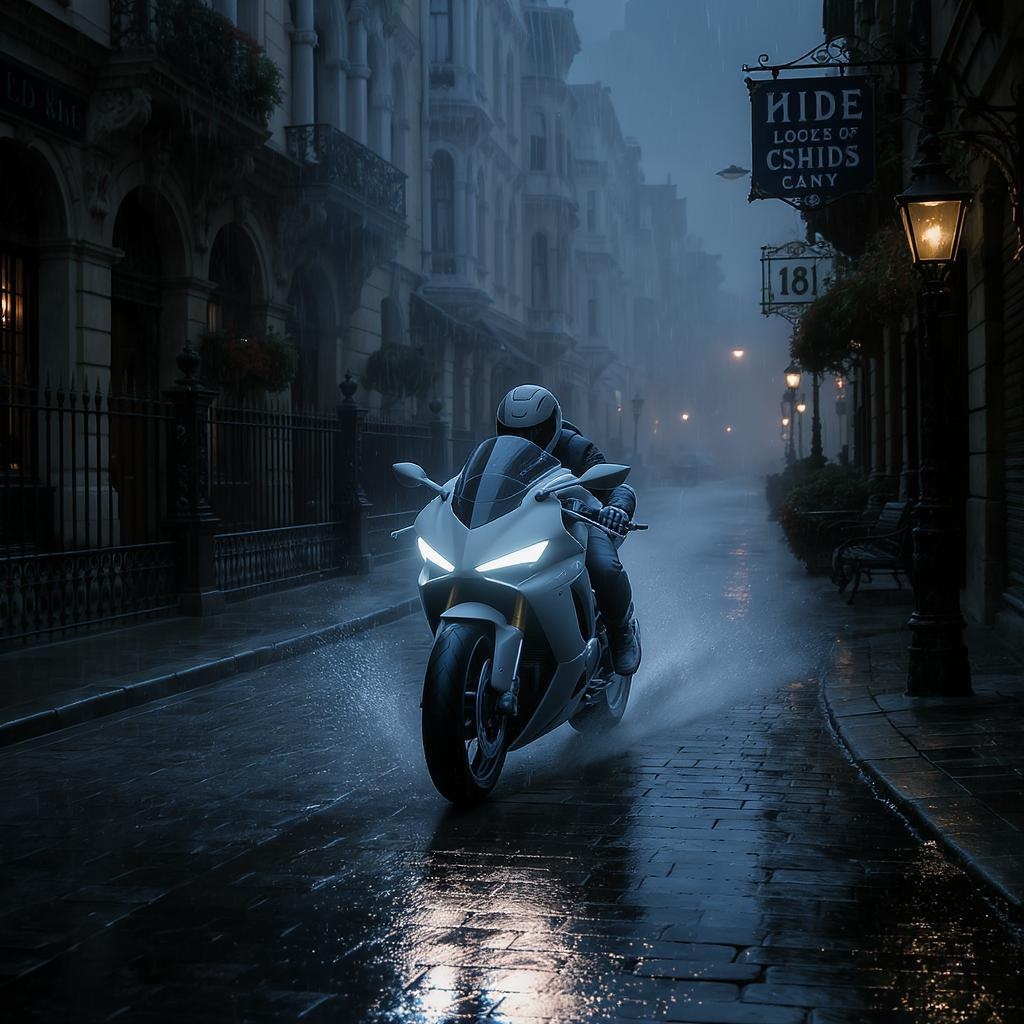 A sleek, pearl-white motorcycle races down a cobblestone street, its futuristic design a stark contrast to the Victorian-era surroundings. It weaves through the misty night, passing under gas-lit street lamps and alongside ornate wrought-iron fences. The rider leans forward, gripping the handlebars as the bike's bright headlights slice through the fog. The intricate facades of the Victorian architecture and vintage shop signs offer a rich backdrop to the scene, where past meets future. Rain puddles on the street mirror the vibrant lights of the motorcycle, amplifying the atmospheric charm and cinematic essence of the moment.