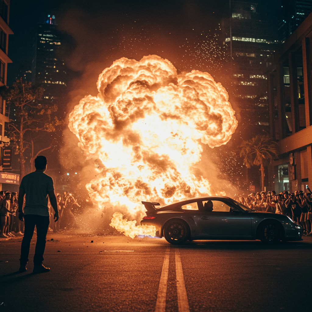 A sleek Porsche, with flames roaring from its exhaust, is skillfully manoeuvred through a congested city street by a renowned action star, as a nearby building is engulfed in towering flames. Amidst the chaos, Dustin Nguyen stands poised, exuding intensity. The explosion behind him colors the night sky, casting a vivid glow. A throng of onlookers gathers, their faces illuminated by the flicker of the blaze, cheering as the scene unfolds like living concept art. The city pulsates with energy, an auto-destructive masterpiece that captures the thrill and danger of the moment.