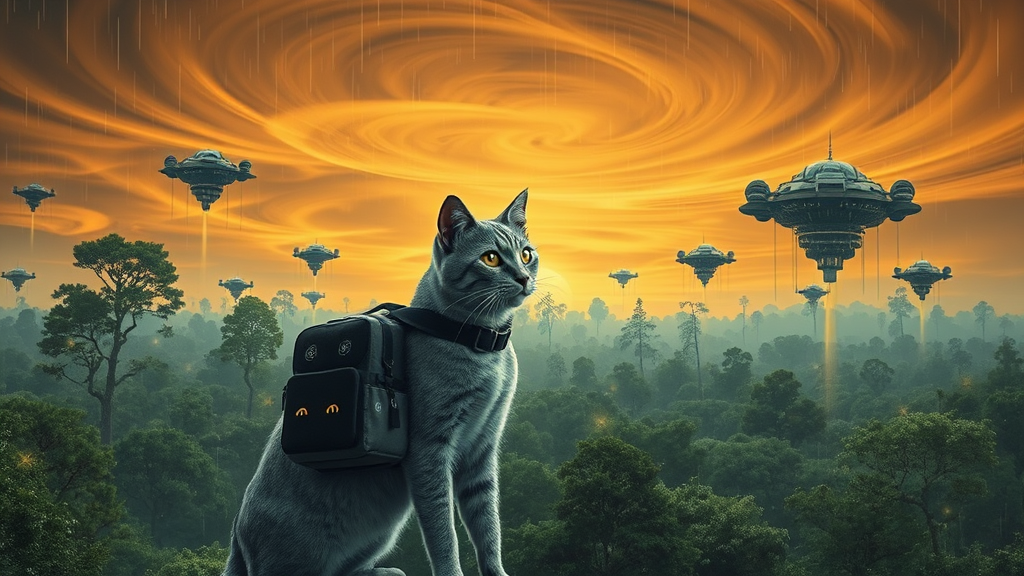 A sleek, silver-furred cat stands poised in the heart of a sprawling, bioluminescent forest where futuristic flying machines hover from levitating islands high above. The sky is a tapestry of swirling amber clouds, and gentle raindrops descend upon the scene, glistening like stardust. The cat's bright eyes gaze intently at the strange, suspended vehicles, curiosity evident in its stance. A compact, high-tech black backpack, adorned with tiny glowing symbols, rests snugly around its neck, giving an air of adventure. The view is cinematic and panoramic, capturing the awe and mystery of this extraordinary world.