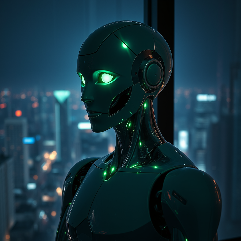 A sleek, silver humanoid robot with glowing green eyes and no visible mouth stands in front of a large, illuminated window, overlooking a vibrant cityscape at night. The scene has a richly dark background, with the soft glow of city lights reflecting off raindrops on the glass. The soft ambient lighting casts gentle, elongated shadows across the robot's face, creating an ethereal glow. It gazes into the distance, evoking a sense of curiosity and yearning for something beyond its current existence, adding a layer of emotional depth and intrigue to the cinematic composition.