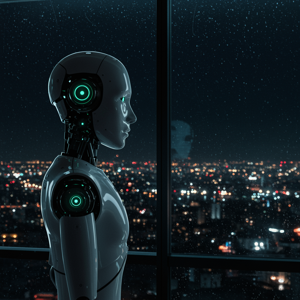 A sleek, silver humanoid robot with softly luminescent green eyes and a subtle, curved line suggesting a mouth, standing in front of a wide, panoramic window overlooking the bustling city sprawled out below at night; the dark backdrop is alive with shimmering lights from the buildings, reflecting mystically on the rain-speckled glass. The scene is cinematic, with soft, ambient lighting casting delicate shadows over the robot's angular face, as it gazes thoughtfully into the horizon, evoking a poignant sense of yearning for something beyond its programmed existence.