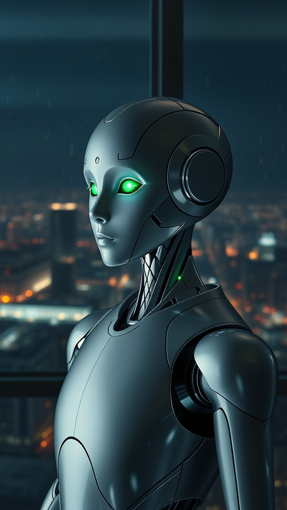 A sleek, silver humanoid robot with softly pulsating green eyes and a minimalist face, standing in front of a large, gently glowing window overlooking a sprawling city at night. The dark background is speckled with the shimmering lights of buildings, their reflections dancing on the raindrops trickling down the glass. The scene, bathed in soft, ambient lighting, casts delicate shadows across the robot's face, which is slightly tilted as it gazes into the distance, evoking a sense of yearning or curiosity about the vast world beyond its metallic exterior.