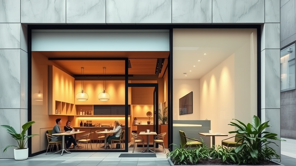 A sleek, stylish cafe store front with large glass windows showcasing the minimalistic interior; sharp, clean lines define the modernist architecture, accentuated by natural wooden elements and simple, elegant decor; patrons enjoy their coffee at minimalist tables under the soft ambient light; lush greenery is strategically placed by the entrance, enhancing the cafe's inviting atmosphere; overall, a harmonious blend of modernism and minimalism, captured in a vivid, eye-catching image.