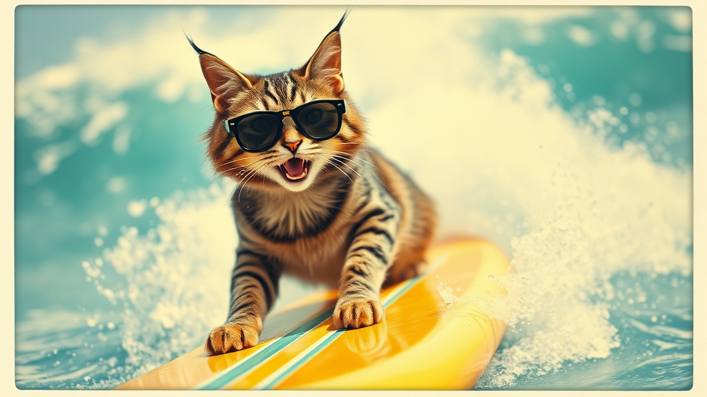 A sleek tabby cat rides a vibrant surfboard through towering ocean waves, its fur ruffled by the wind. Sporting stylish aviator sunglasses, the feline's mouth is open in a gleeful yowl, capturing the thrill of the adventure. Framed as a vintage polaroid, the image hints at a playful, sun-drenched beach day, immortalizing the cat's daring escapade.