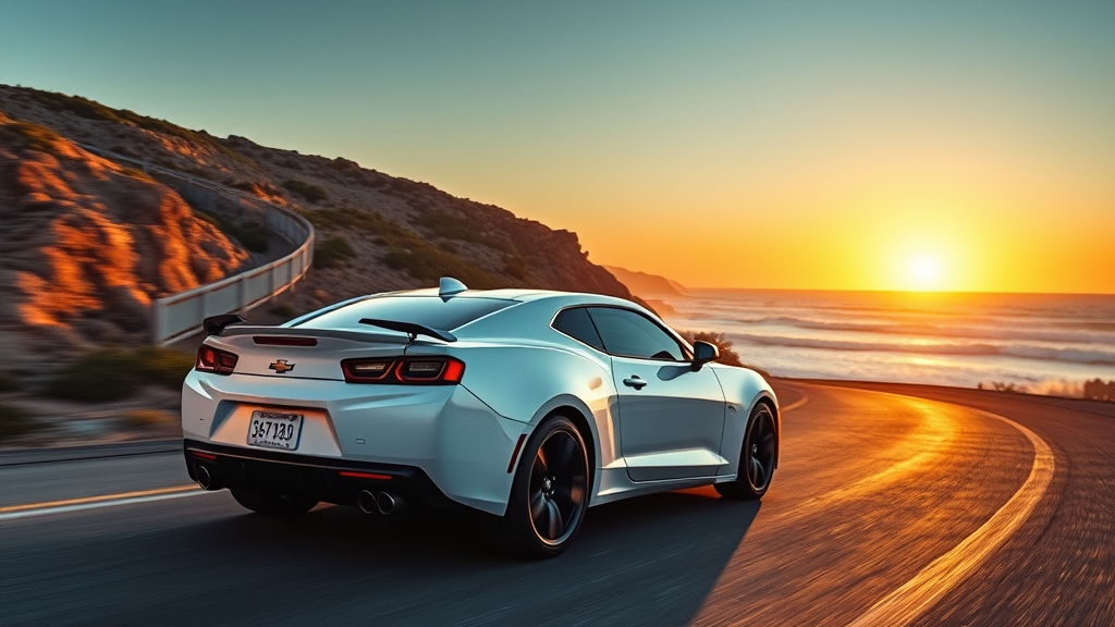 A sleek white 2020 Camaro SS cruises down a winding coastal road under a vibrant sunset, the gleam of its freshly polished exterior shimmering in the golden hour light. Ultra-HD cinematic visuals capture every detail of the car's dynamic curves and aggressive stance, with 32k super-resolution showcasing the precision engineering and raw power of this iconic muscle car. The camera pans to reveal pristine ocean waves crashing against the rocky shoreline, complementing the Camaro's commanding presence and creating an exhilarating, immersive experience.