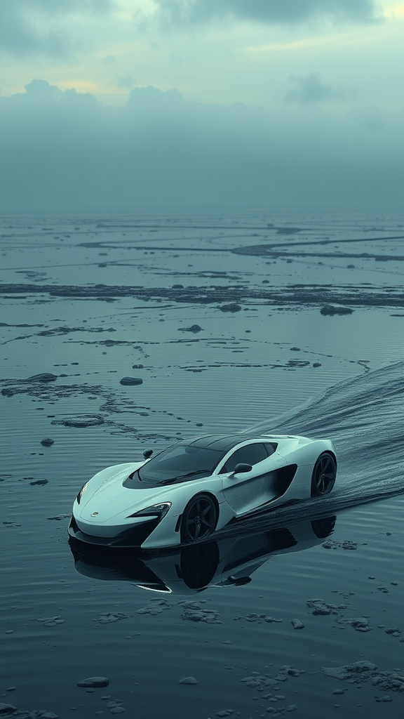 A sleek white car glides effortlessly across the surface of a waterlogged landscape, its design reminiscent of cutting-edge spaceships, nestled amidst eerie, otherworldly scenery. The scene evokes an atmosphere of somber serenity, echoing the haunting artistry of Nikita Veprikov with a touch of Lovecraftian mystery. The horizon is dotted with a fusion of oceanic academia and elaborate spacecraft design, casting shadows over the water's shimmering surface, as distant nebulae light up the sky in muted hues.