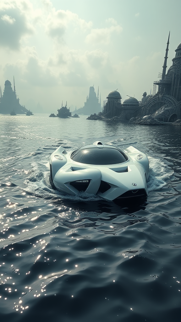 A sleek white car navigates through shimmering water, its design echoing futuristic spacecraft, gliding effortlessly across an alien seascape. The surrounding landscape exudes an eerie atmosphere, reminiscent of oceanic academia intertwined with the elaborate structures of advanced spacecraft. The scene is imbued with a somber mood, drawing inspiration from the intricate and surreal art of Nikita Veprikov, while hints of Lovecraftian mystery linger in the shadows, suggesting ancient, hidden depths beneath the waves.