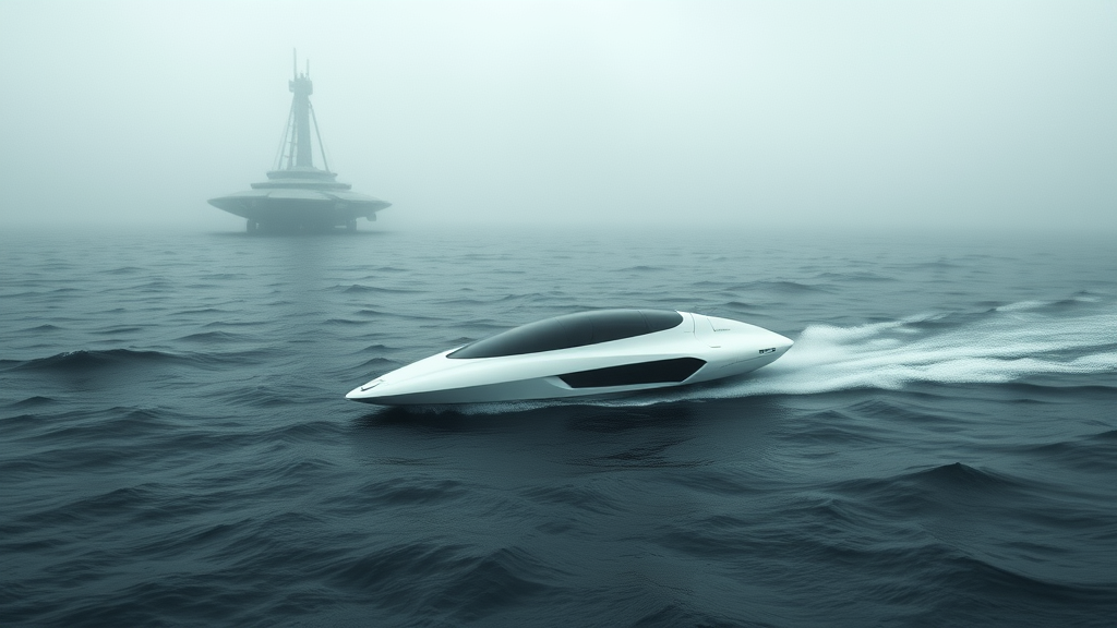 A sleek, white vehicle glides seamlessly through a vast expanse of water, its design echoing the aesthetics of a futuristic spacecraft. The scene is enveloped in an eerie landscape, where mist drifts over dark, mysterious waves, evoking a somber mood. Towering structures reminiscent of elaborate alien spacecrafts dot the horizon, their intricate details flickering in the dim light. The setting feels steeped in oceanic academia, with hints of ancient knowledge embedded in the water's depths. Lovecraftian elements whisper at the edges of perception, infusing the environment with an unsettling, otherworldly presence, akin to the evocative works of Nikita Veprikov.