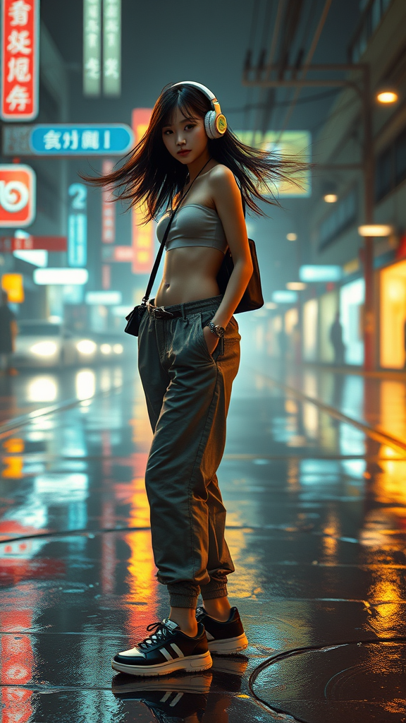 A slender Asian girl with a striking appearance wears baggy clothes, including trousers and sneakers, set in a minimalistic, Tsutomu Nihei-inspired scene. The setting is of a cyberpunk atmosphere with a highly detailed, neon-lit background reflecting off wet surfaces. The girl has dynamically flowing hair, adding a touch of realism and movement. She accessorizes with headphones and a women's bag, contrasting with her edgy, slightly goth style. The scene is captured with a cinematic lighting that emphasizes depth of field, making it appear super detailed and hyper photorealistic. The aesthetic merges tightly worn clothes with bare skin, highlighted by a network of crooked wires against a background of blinding lights and golden hues. Despite the minimalist approach, the depiction maintains clarity and sophisticated design elements, avoiding distortions, poor anatomy, or any form of artistic defects, resulting in a cohesive and captivating visual experience.