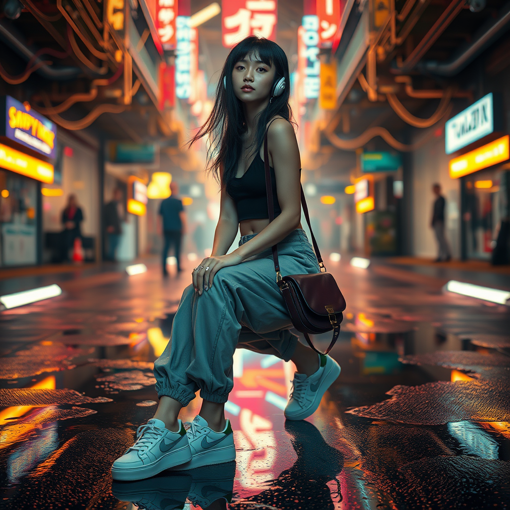 A slender Asian woman exudes a stunning allure, dressed in baggy trousers and sneakers. Her minimalist style reflects the influence of Tsutomu Nihei, set against a cyberpunk backdrop alive with neon lights and reflective puddles. The composition features goth-inspired elements, rich depth of field, and cinematic lighting enhancing the hyper-photorealistic imagery. Her hair flows dynamically, complementing her minimal attire and skin-baring details. Accessories like headphones and a chic women's bag add modern flair. Intricate webs of wires and striking piercings accentuate the scene's cyber aesthetic. The play of blinding light, gold hues, and rivets create a symmetrical yet surreal atmosphere. The creation maintains high-quality imagery free of distortion, embracing a lifelike expression and vibrant coloration.