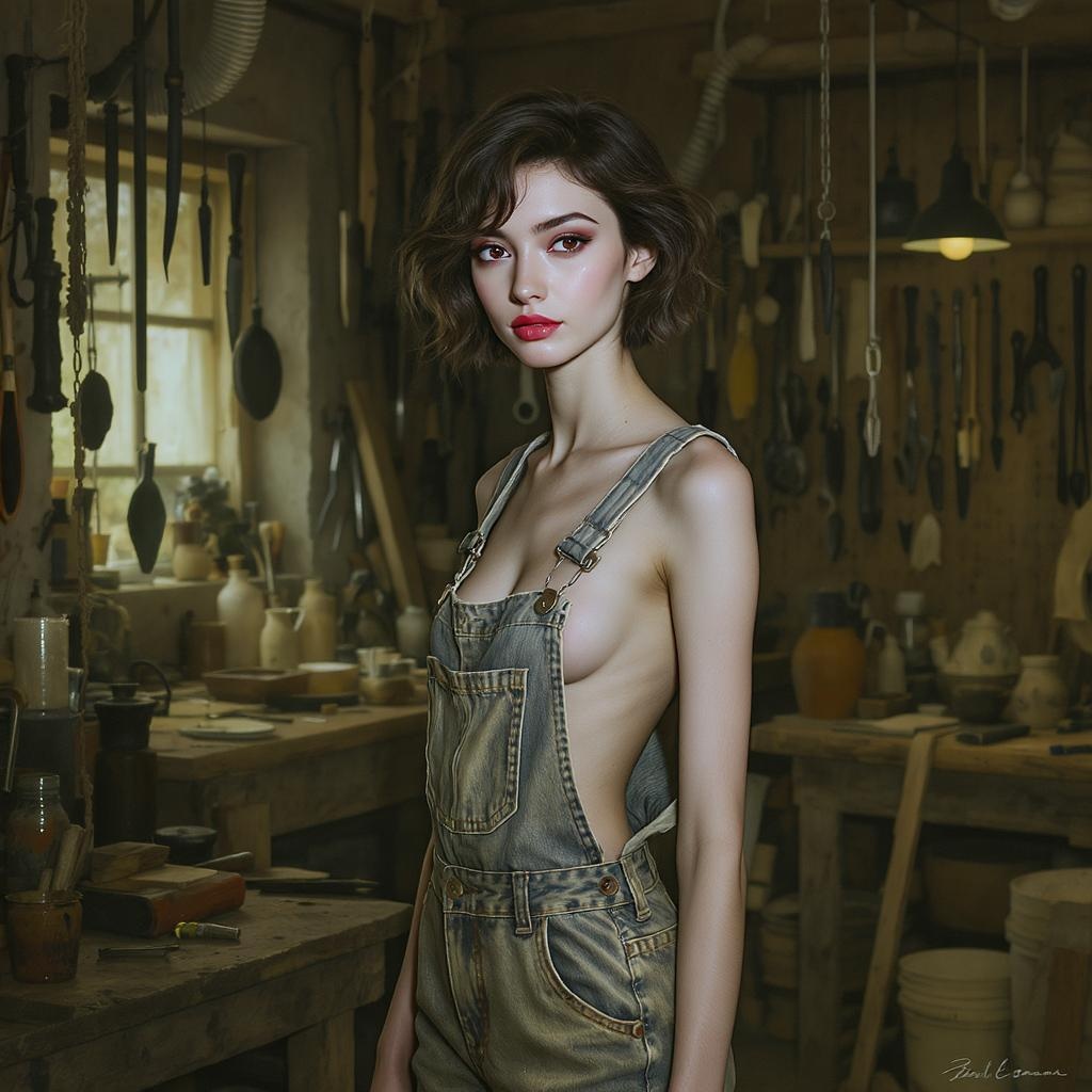 A slender figure stands confidently, gazing directly at the viewer with an expression of calm determination. Clad in a pair of rugged overalls that hug their form, there's an air of effortless allure as the silhouette hints at a subtle sideboob glimpse. Their short, wavy hair frames their face in soft tendrils, adding to the charm. The intricate details of the scene reveal a bustling workshop backdrop, filled with an array of tools and materials that speak to creativity and craftsmanship, all rendered with an eye for detail that brings the setting vividly to life.