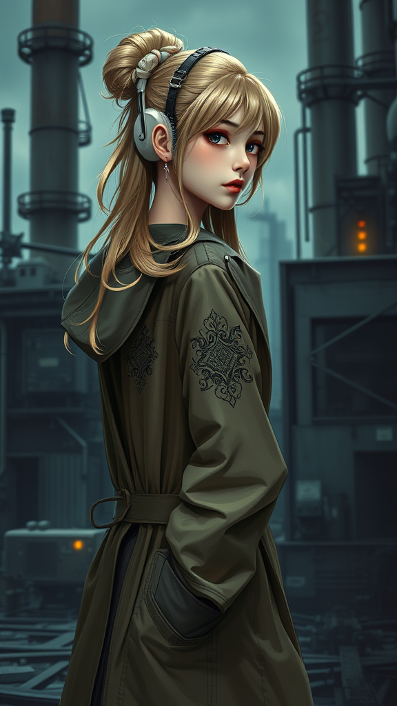 A slender girl in an imperial-style officer's open raincoat with intricate decor, featuring photo-realistic loose blonde hair and a stunning face with Korean-inspired makeup, stands in a dieselpunk setting. The background showcases a diesel plant with a retro-futuristic vibe, evoking social art themes. The image is rich in maximum detail, combining vintage elements with hyper-photorealism in dark tones. This digital painting offers complex details and a detailed illustration from a side view, illuminated by multiple light sources. The girl's hands are casually placed in her pockets, and she wears a distinctive headdress and headphones with her hair gracefully styled in a bun. The composition adheres to realism, avoiding any anatomical or visual distortions, and maintains a high-quality finish without artifacts or blurring.