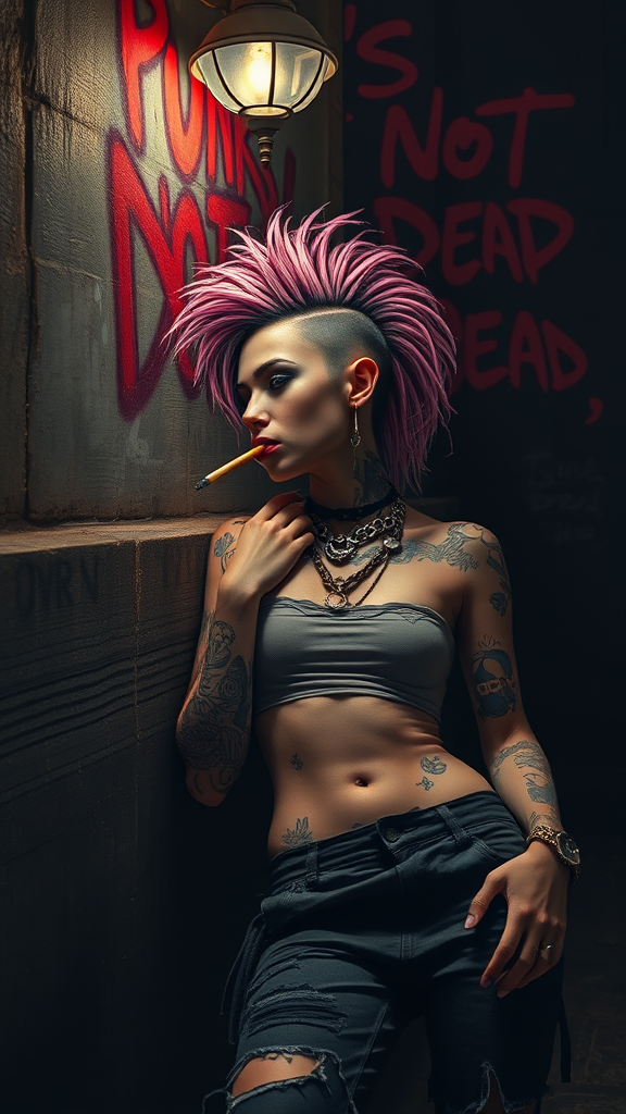 A slender punk female leans reclined against a dimly lit alley wall, savoring a smoldering cigarette. Her pink and black dreadlocks cascade over a side mohawk, casting shadows in the subtle glow of the streetlamp. Bold red graffiti proclaims "Punk's Not Dead" above her. Adorned with oversized necklaces and intricate tattoos covering her body, she exudes defiance. Her nose, lip, and eyebrow piercings glint in the dim light. Dressed in a worn, cropped tank top paired with dirty, torn clothes, she embodies punk rebellion. The wide, dark background envelops her in a vast urban expanse. Captured in hyper-realistic detail and intricate artistry, reminiscent of a Luis Royo illustration with Rembrandt lighting, this concept art piece captures the essence of fantasy and the sharp edge of punk culture.