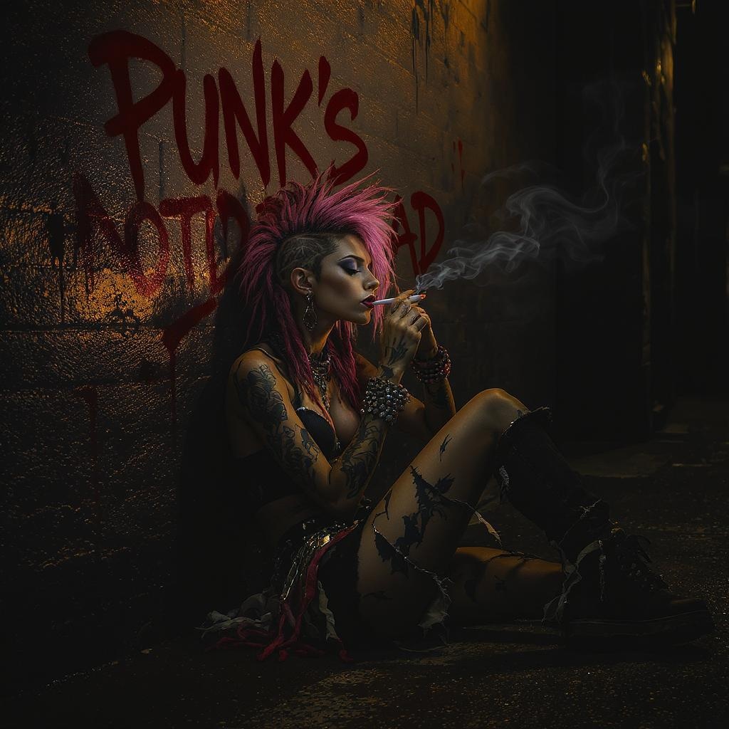 A slender punk female lounges against the wall of a dimly lit alley, a brief cigarette nestled between her fingers as she takes a moment to savor its fleeting embers. The wall behind her is emblazoned with the bold, rebellious statement "Punk's Not Dead" scrawled in fierce red spray paint. Her intricate dreads cascade in a striking mix of pink and black, complementing her distinctive side mohawk haircut. Adorning her are large, layered necklaces and an array of tattoos that cover her body like a vivid tapestry. Her face is punctuated with piercings on her nose, lip, and eyebrow, adding to her edgy persona. She wears a worn-out crop tank top paired with intentionally distressed and tattered clothing, echoing her nonconformist spirit. The setting is enveloped in a wide, dark background, evoking the style of a Luis Royo illustration with its compelling fusion of fantasy and hyper-realism. The scene is illuminated with dramatic Rembrandt lighting, revealing hyper-detailed and intricately sharp features that contribute to a rich concept art aesthetic.