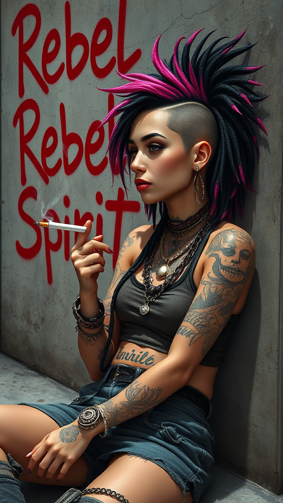 A slender punk female lounging casually against a gritty street wall, enjoying a lit cigarette, with the words "Rebel Spirit" spray painted in vivid red. Her hyper-realistic features include intricately detailed dreads in vibrant pink and deep black, styled into a striking half-mohawk. Adorned with large, eclectic necklaces and an array of tattoos covering her skin, she sports piercings on her nose, lip, and eyebrow. Her worn crop tank top and tattered, grimy clothing reflect her defiant lifestyle. The wide, shadowy background sets the scene, inspired by Luis Royo's illustration style with a touch of Rembrandt's dramatic lighting. This concept art piece captures a fantasy world that's hyper-detailed, richly intricate, and sharply focused.