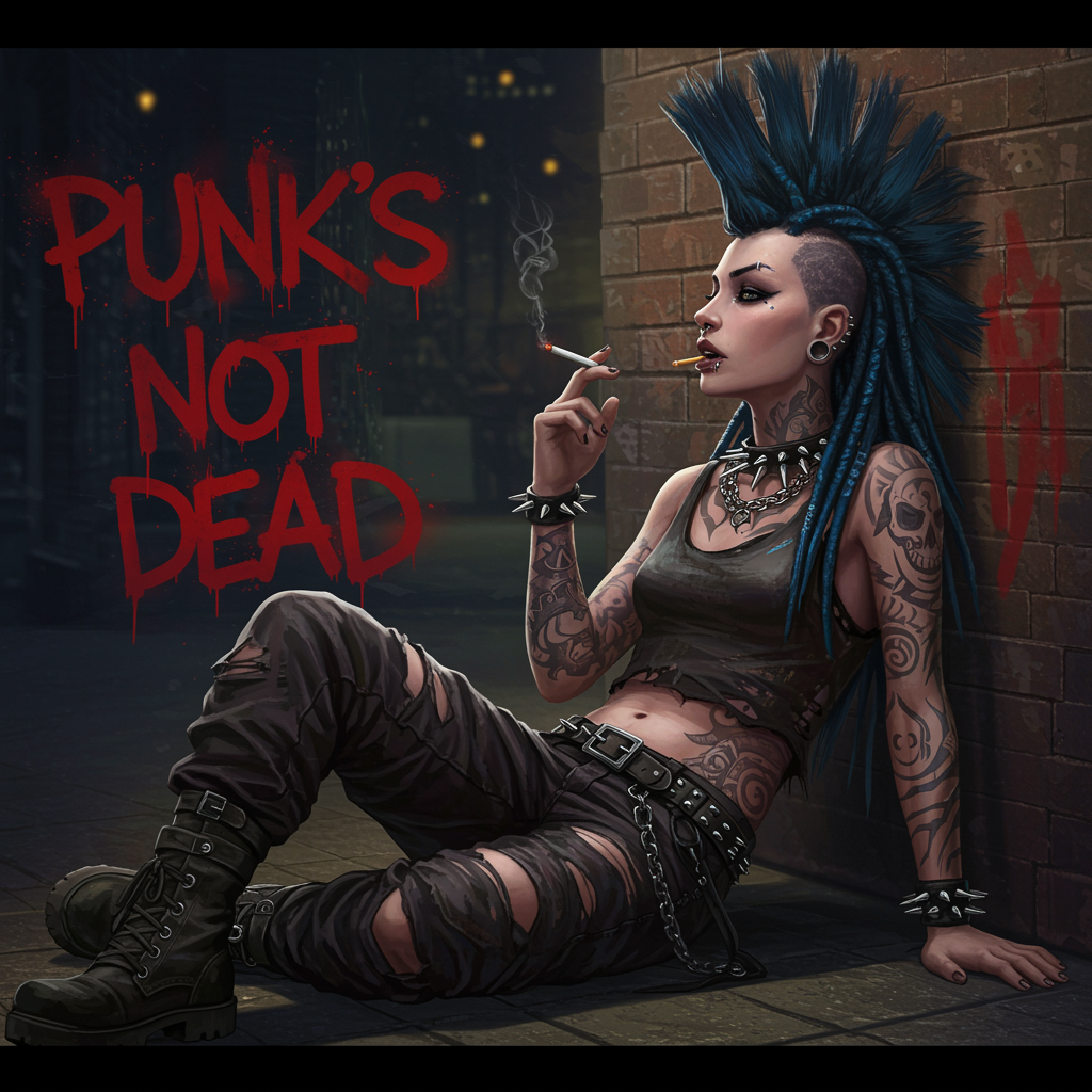 A slender punk female reclined against a shadowy alley wall, savoring a slender cigarette, the words "Punk's Not Dead" sprayed in vivid red across the wall. Her hyper-realistic appearance features intricate dreads interwoven with strands of electric blue and black, styled into a dramatic side mohawk. She wears commanding, chunky necklaces that catch the glimmer of the dim streetlights. Her skin is a canvas of elaborate tattoos that swirl across her limbs, visible through a worn crop tank top. Facial piercings adorn her nose, lip, and eyebrow, adding to her rebellious aura. Her attire consists of tattered and grimy clothing, telling tales of countless adventures. The setting is framed by a wide, dark background, drawing inspiration from Luis Royo's illustration style with Rembrandt lighting. This concept art captures a hyper-detailed, intricate scene that is both fantasy and reality, with sharp focused details.