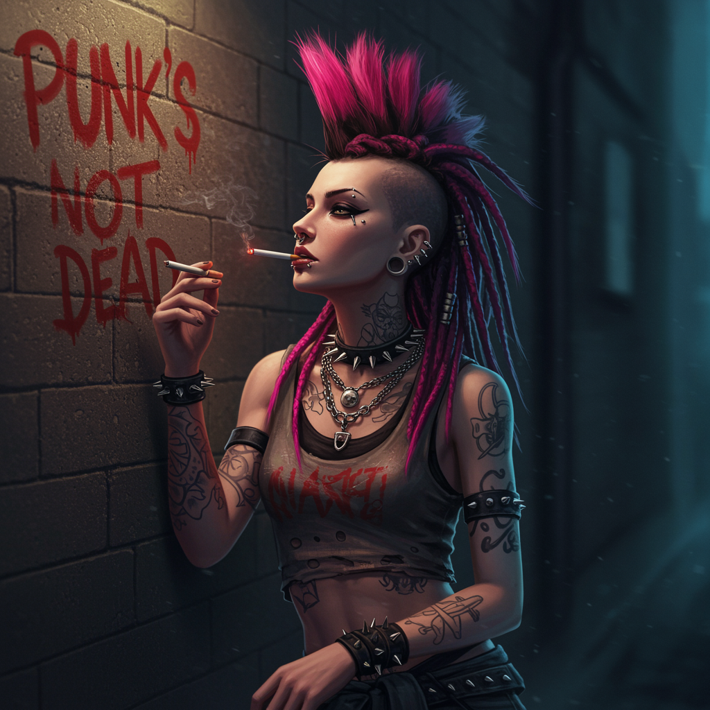 A slender punk female reclined against the gritty wall of a shadowy alley, savoring the last embers of a short cigarette. Across the wall, a bold declaration in crimson spray paint reads, "Punk's Not Dead." Her intensely detailed dreads spill down, a striking mix of neon pink and jet black, complementing her edgy side mohawk. Adorned with large, eclectic necklaces, her skin is a canvas of intricate tattoos, visible across her arms and torso. Silver piercings accentuate her nose, lip, and eyebrow, adding to her rebellious aura. She wears a faded crop tank top, and her worn, torn clothes are a testament to her hard-edged lifestyle. The dim, expansive background wraps around her, reminiscent of a Luis Royo illustration, bathed in Rembrandt-inspired lighting. The scene is a fusion of concept and fantasy art, hyper detailed with sharp focus, capturing the essence of untamed spirit and resilience.