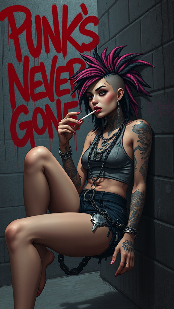 A slender punk female reclined against the wall of a dimly lit alley, savoring a stubby cigarette, the graffiti behind her boldly declaring "Punk's Never Gone" in vibrant red. Her hair is a wild array of detailed pink and black dreads, accentuated by a side mohawk. She's adorned with cascading large necklaces and her body is a canvas of intricate tattoos. Piercings embellish her nose, lip, and eyebrow, adding to her fierce demeanor. Her worn crop tank top clings loosely, accompanied by tattered clothes that hint at a life of rebellion. The wide, shadowy background is reminiscent of Luis Royo's illustrations, utilizing Rembrandt lighting to cast dramatic shadows. This concept art merges fantasy and reality, capturing hyper-detailed and intricate elements with sharp focus, portraying her as a modern warrior of the streets.