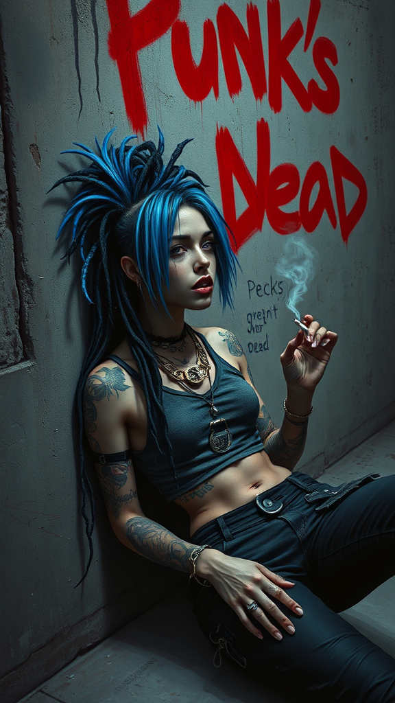 A slender punk female reclines against the grimy wall of a dimly lit alley, savoring a stub of a cigarette. The wall behind her is emblazoned in bold red spray paint declaring "Punk's Not Dead". Her hyper-realistic appearance features intricate dreads interwoven with vibrant strands of electric blue and black hair, styled in a striking side mohawk. She is adorned with a collection of large, mismatched necklaces that jingle softly. Her skin is a canvas of tattoos, each telling a story, and her face is embellished with piercings in the nose, lip, and eyebrow. She wears a worn-out crop tank top that clings to her frame, and her clothes are deliberately distressed, showcasing tears and patchwork. The atmosphere is enhanced by the wide, shadowy background, exuding a vibe akin to a Luis Royo illustration. Bathed in Rembrandt lighting, the scene carries a touch of fantasy art flair, captured in hyper-detailed, intricate, and sharp focus, teasing the depth of her defiant spirit.
