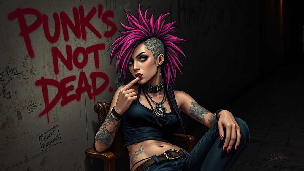A slender punk female reclines against the gritty wall of a dimly lit alleyway, savoring a smoldering cigarette. The phrase "Punk's Not Dead" is boldly spray-painted in crimson above her. Her hair is a striking blend of pink and black dreads, styled into a side mohawk, creating a dramatic silhouette. She dons large, eclectic necklaces and her skin is a canvas of intricate tattoos. Her face is adorned with piercings in her nose, lip, and eyebrow. She's wearing a distressed crop tank top paired with tattered clothing that speaks of a rebellious lifestyle. The wide, shadowy background provides a stark contrast, and the scene is bathed in Rembrandt lighting, highlighting her features with a palpable intensity. The setting merges elements of Luis Royo's illustration style with the depth of fantasy art, rendered in hyper-realistic precision, showcasing every intricate detail in sharp focus, capturing the essence of a hyper-detailed masterpiece.
