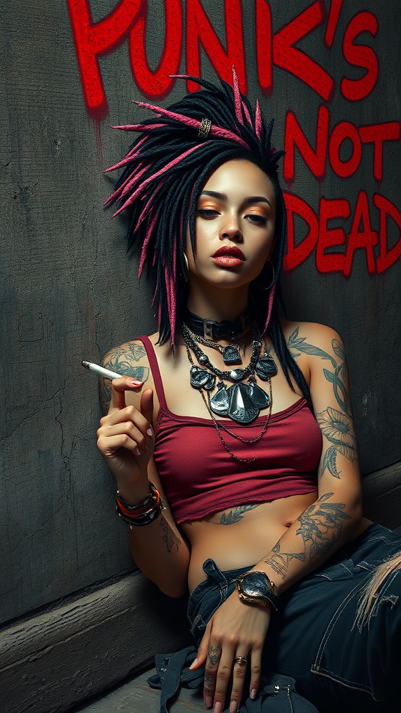 A slender punk female reclines against the gritty wall of a shadowy alley, savoring the last embers of a cigarette. The wall boldly proclaims "Punk's Not Dead" in vibrant red spray paint. Her hyper-realistic features include intricately styled dreads merging pink and black tones, paired with a distinctive side mohawk. Large, statement necklaces drape around her neck, while her skin displays an array of intricate tattoos. Facial piercings adorn her nose, lip, and eyebrow, giving her an edgy allure. She wears a worn, cropped tank top, and her clothes are dirty and torn, adding to the raw authenticity of her look. The scene is set against a wide, dark background, reminiscent of a Luis Royo illustration, utilizing Rembrandt lighting to illuminate her presence. This concept art piece is a fantasy art masterpiece, with hyper-detailed and intricate features captured in sharp focus, showcasing the rebellious spirit in the highest quality.